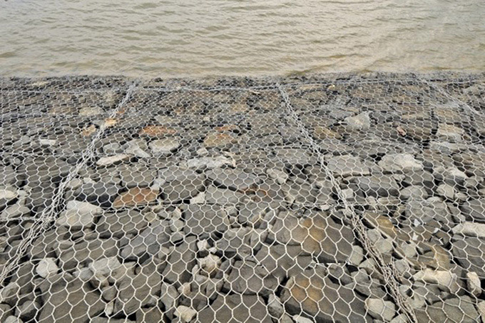 雷諾護(hù)墊是指由機(jī)編雙絞合六邊形金屬網(wǎng)面構(gòu)成的厚度遠(yuǎn)小于長度和寬度的墊形工程構(gòu)件,其中裝入塊石等填充料后連接成一體,成為主要用于水利堤防、岸坡、海曼等的防 沖刷結(jié)構(gòu),具有柔性、對地基適應(yīng)性的優(yōu)點(diǎn)。